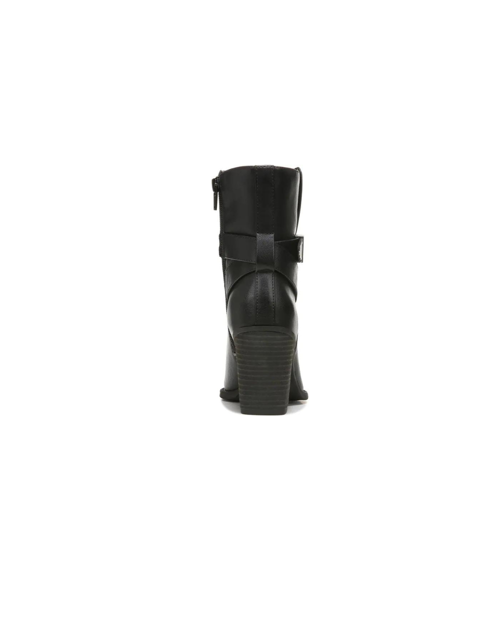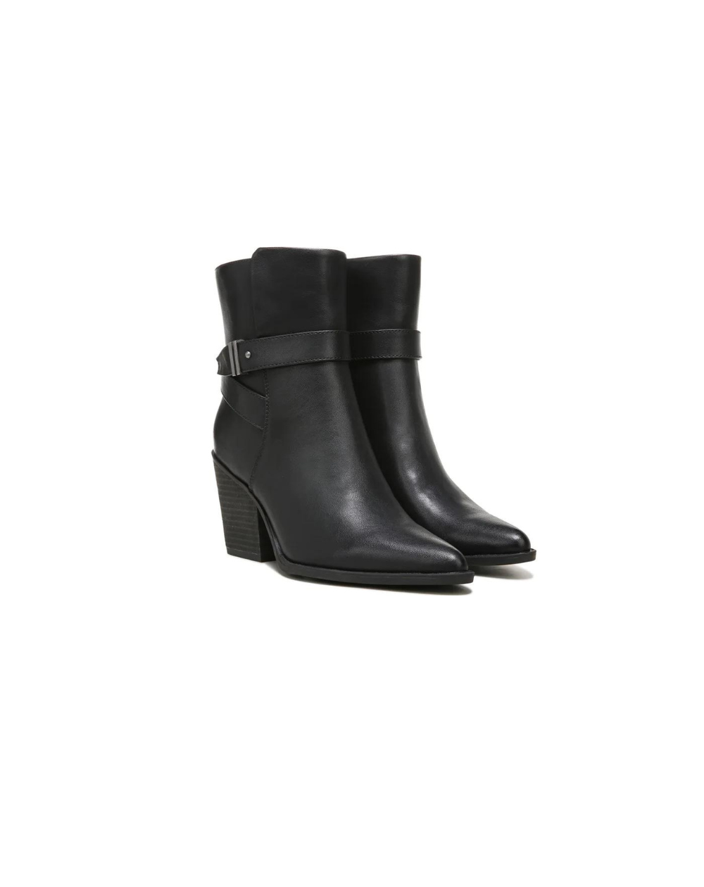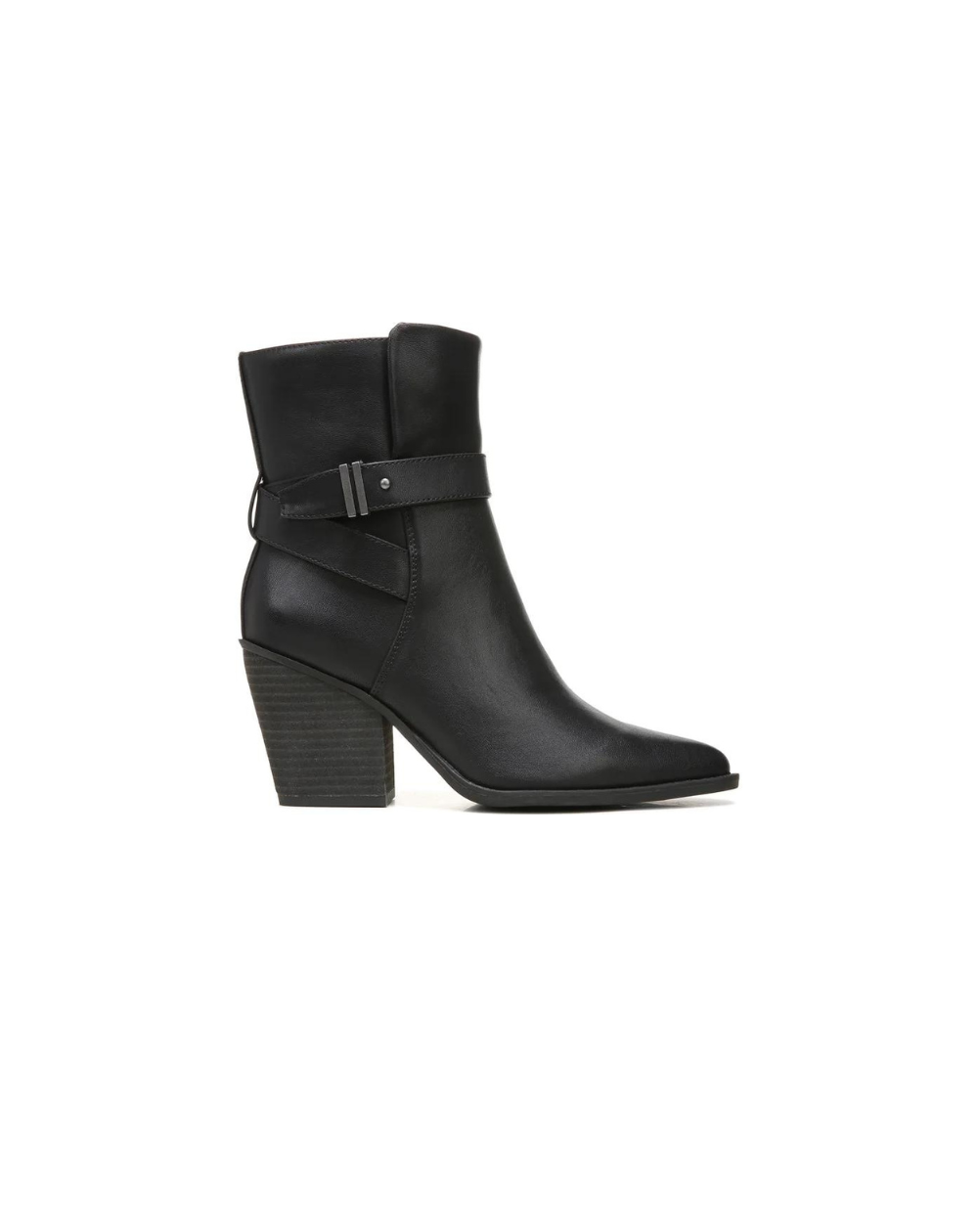 Una correa con hebilla envolvente agrega un estilo clásico a estas elegantes botas de punta almendra.